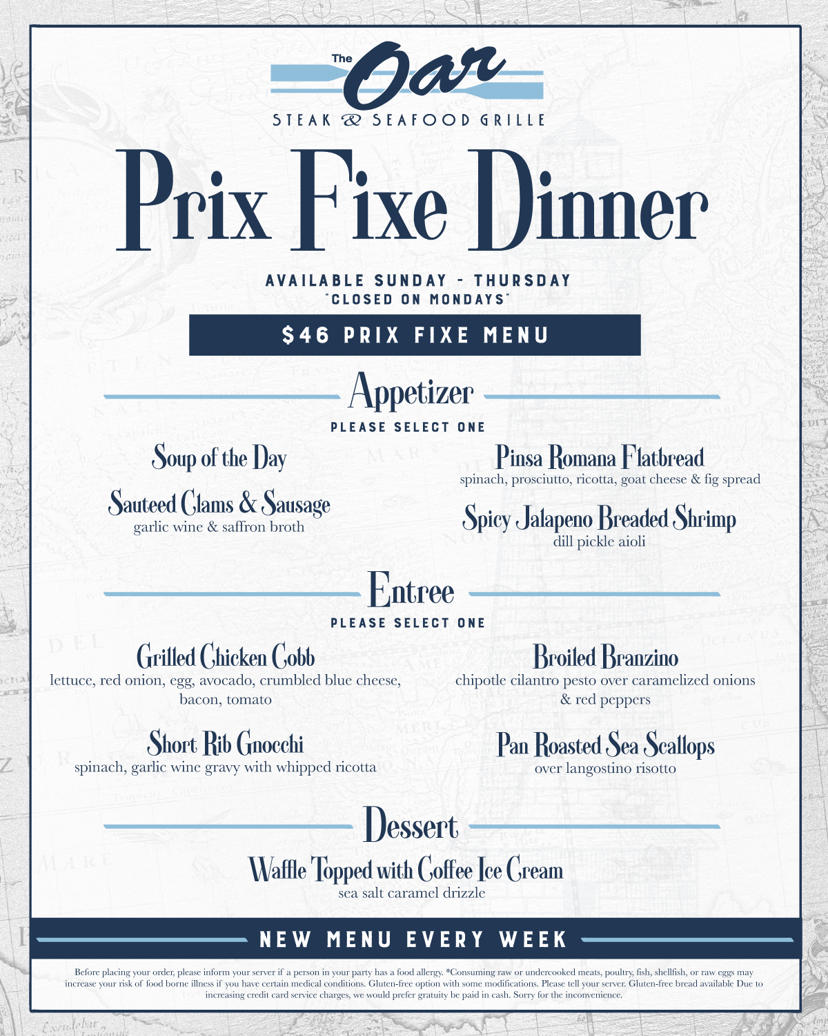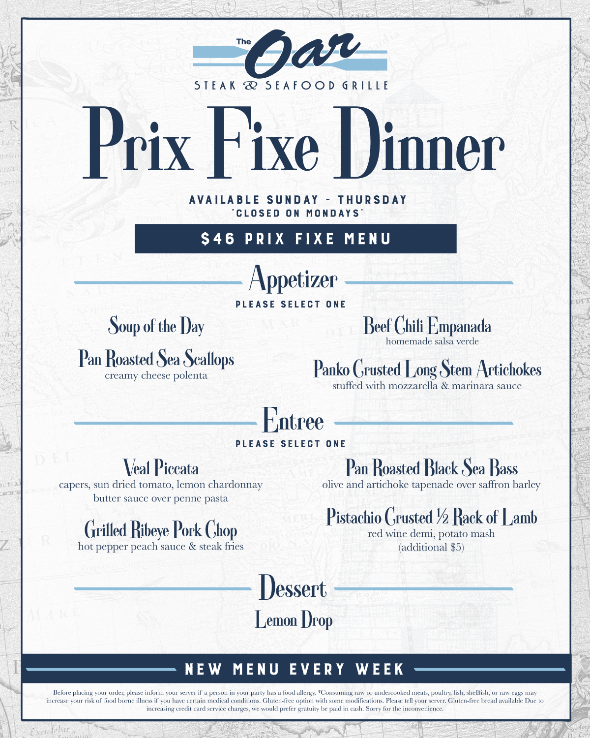 From its start as a small snack bar to its evolution into a gourmet river front dining location, The Oar has grown into a special place for any meal, on any occasion during any season – and it’s right here on Long Island in Patchogue, New York. At The Oar, you’ll find that the community is part of what makes it so special. Oars from loyal customers and businesses adorn the walls while regulars chat happily with our friendly staff. We offer exquisite steak and seafood cuisine for lunch and dinner. Whether you’re looking for a gorgeous spot in Patchogue to dock your boat and enjoy a meal or wanting a delicious intimate date night with a juicy steak – The Oar is the perfect place for you to have an unforgettable meal. Come drop your anchor at The Oar!